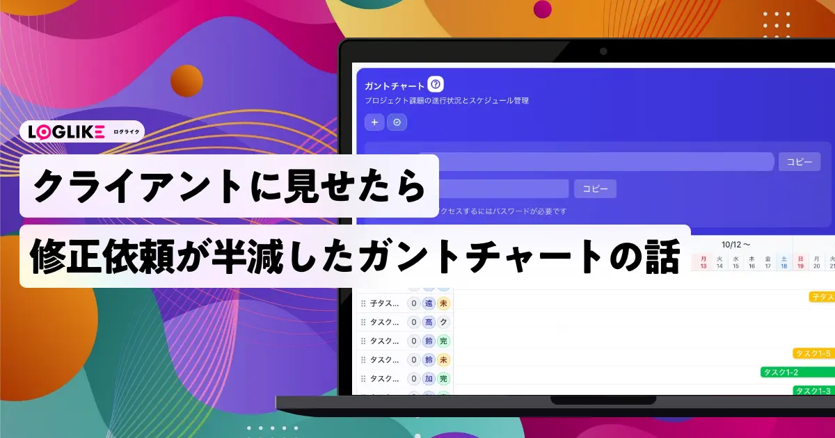 LOGLIKEは案件管理の中にガントチャートが組み込まれていて、案件ごとにURLを発行して外部共有できます。クライアント側はログインなしで進捗を確認できるので、「共有したのに見てもらえない」問題が起きにくい設計です。