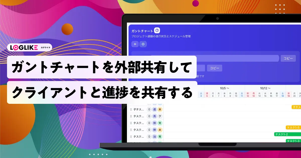 ガントチャートをパスワード保護された専用URLで共有できる機能です。LOGLIKEアカウントを持っていないクライアントでも、ブラウザから最新の進捗を確認できます。